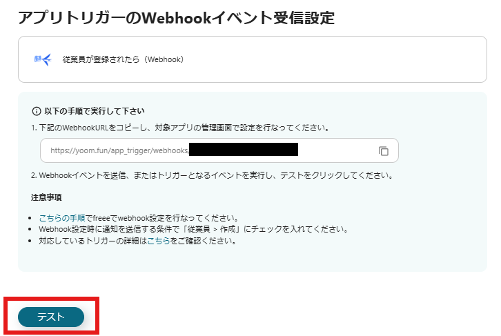既にfreee人事労務の情報を取得するよう、内容の入力がされているためこのまま「テスト」→「保存する」をクリックしましょう。