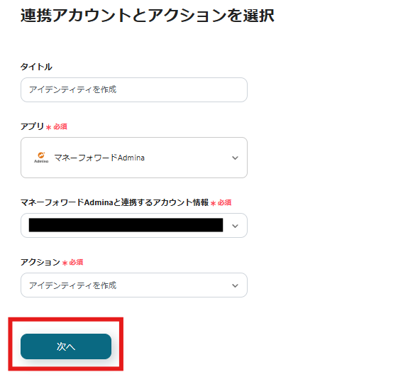 連携アカウントとアクションを選択の画面では「次へ」をクリックしましょう。