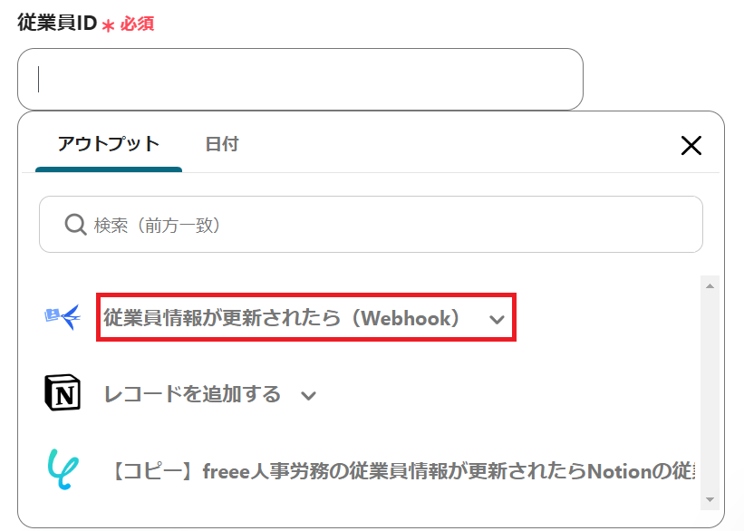 2.freee人事労務のアイコンの「新従業員情報が更新されたら(Webhook)」を開く