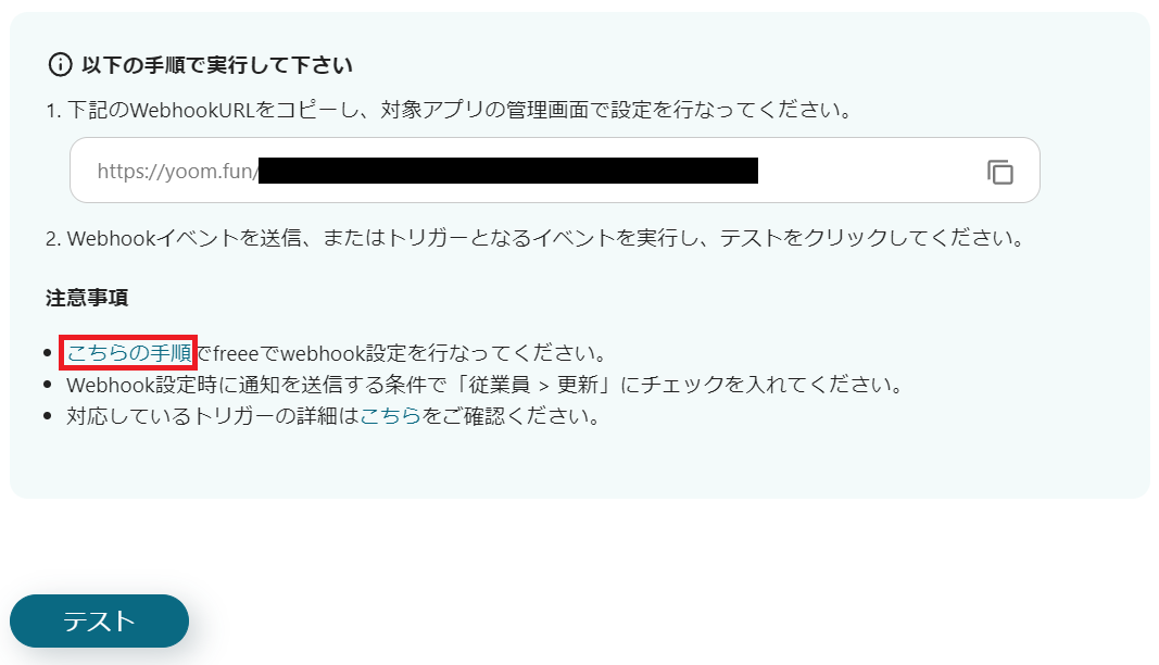 その後Yoomの画面に戻り、テストボタンをクリックします。