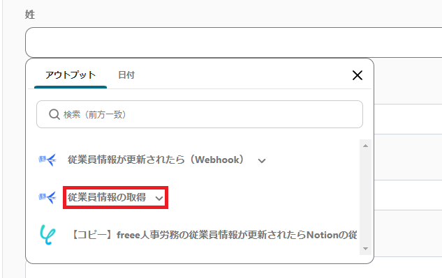 Yoomの画面に戻り、左側のメニューから「【コピー】freee人事労務の従業員情報が更新されたらNotionの従業員管理表も更新する」を選択します。