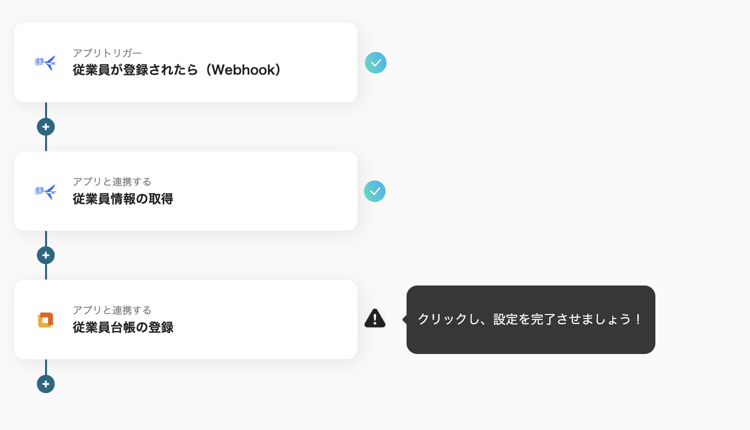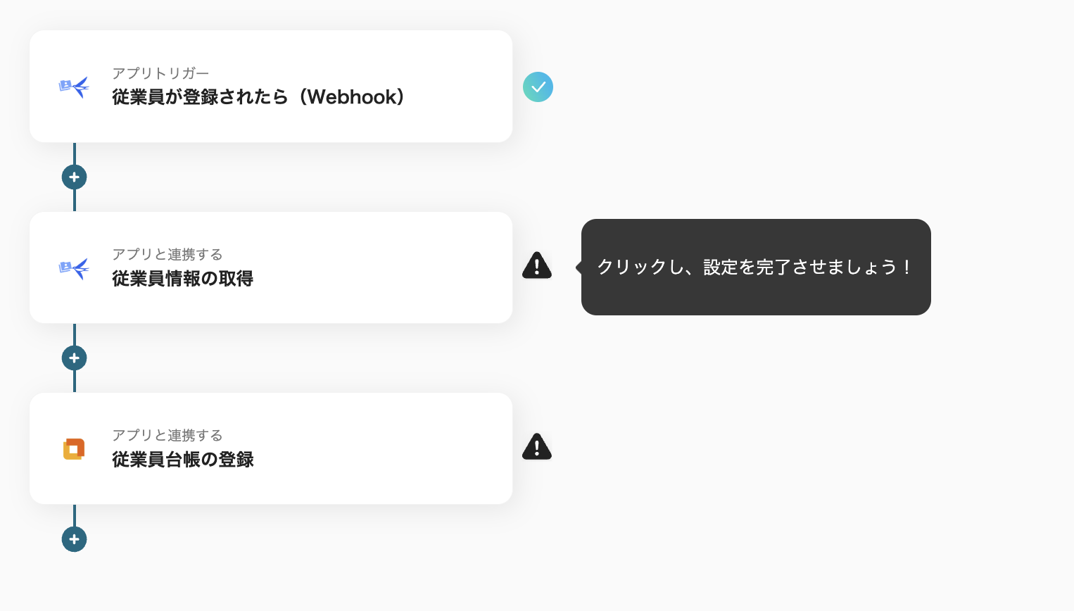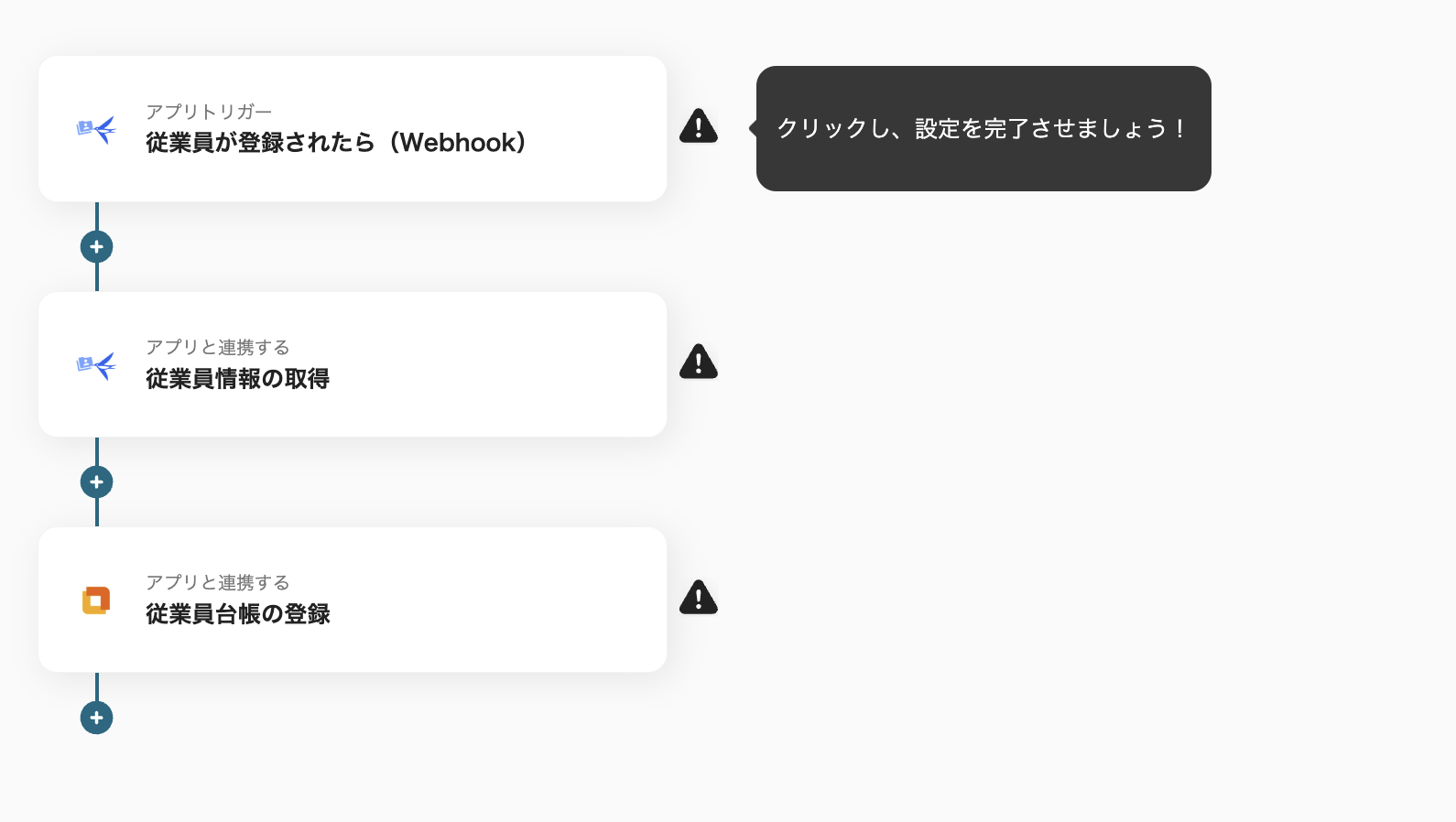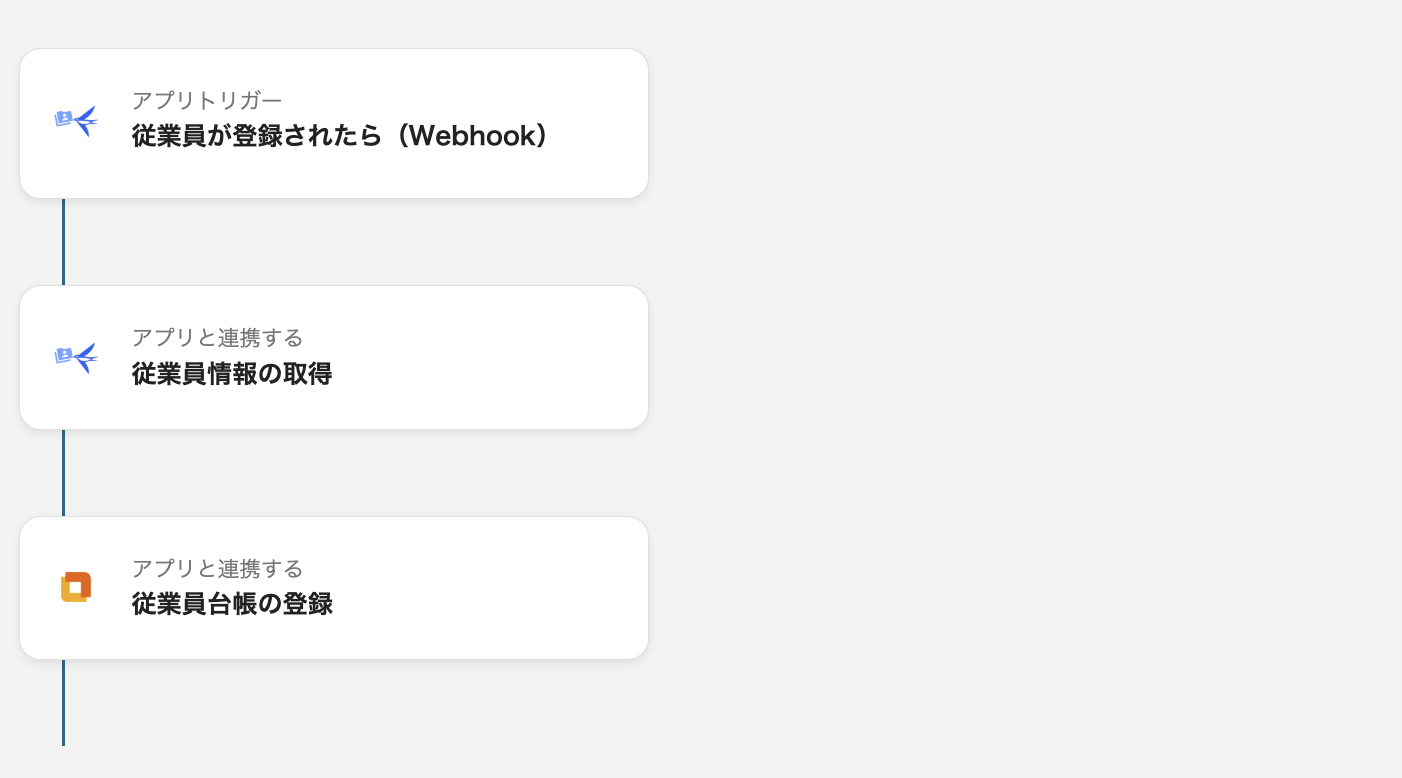 (2)まずはトリガーとなる「従業員が登録されたら(Webhook)」をクリックします。