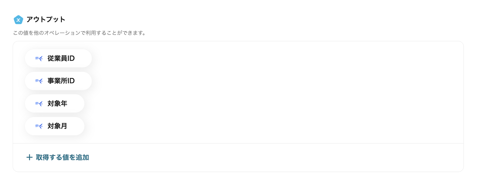アウトプット情報は、「この値を他のオペレーションで利用することができます。」という注釈の通り、この後のステップで引用・活用できます。