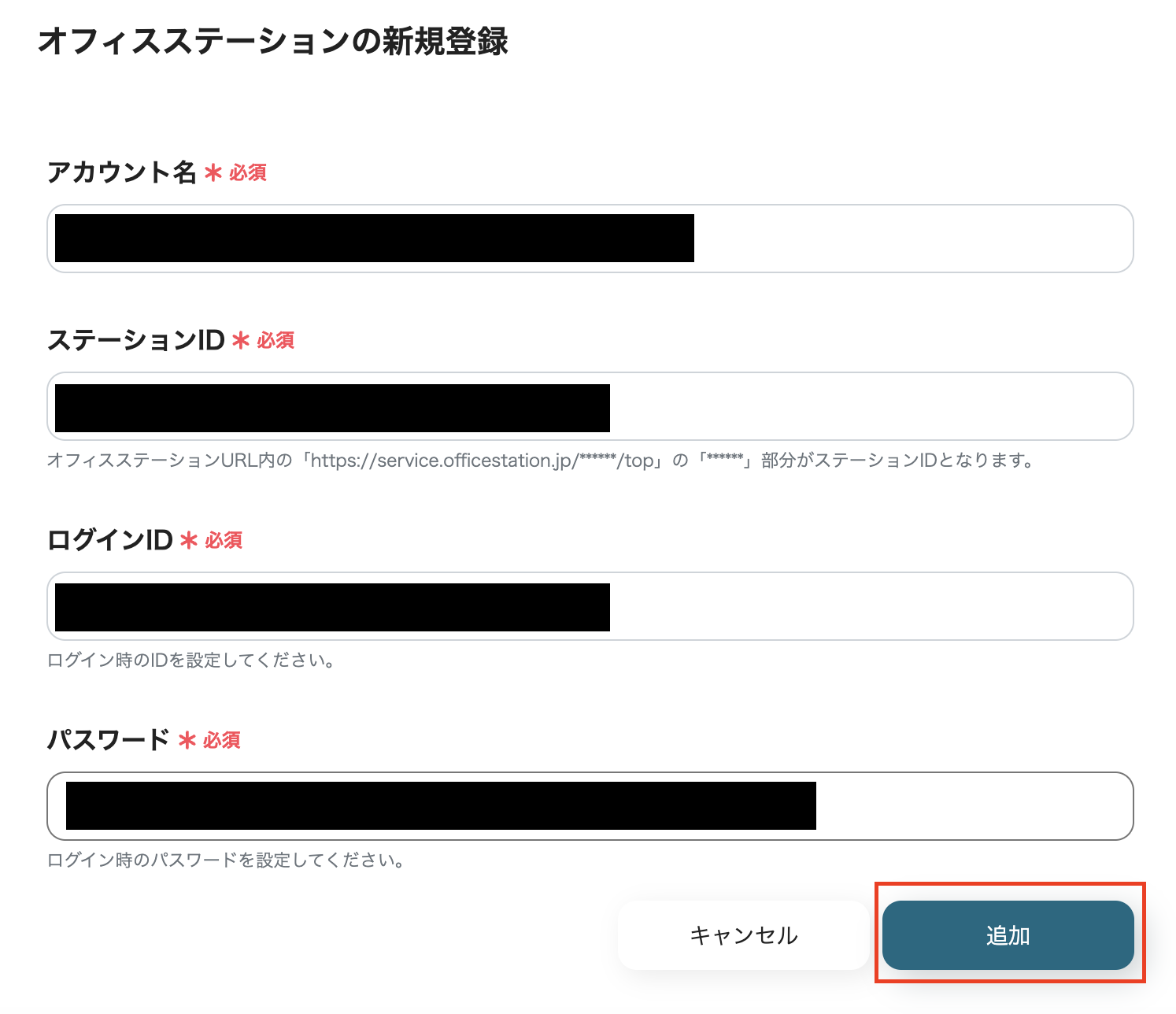 (5)「アカウント名」と「ステーションID」、「ログインID」、「パスワード」を入力し、[追加]をクリックします。