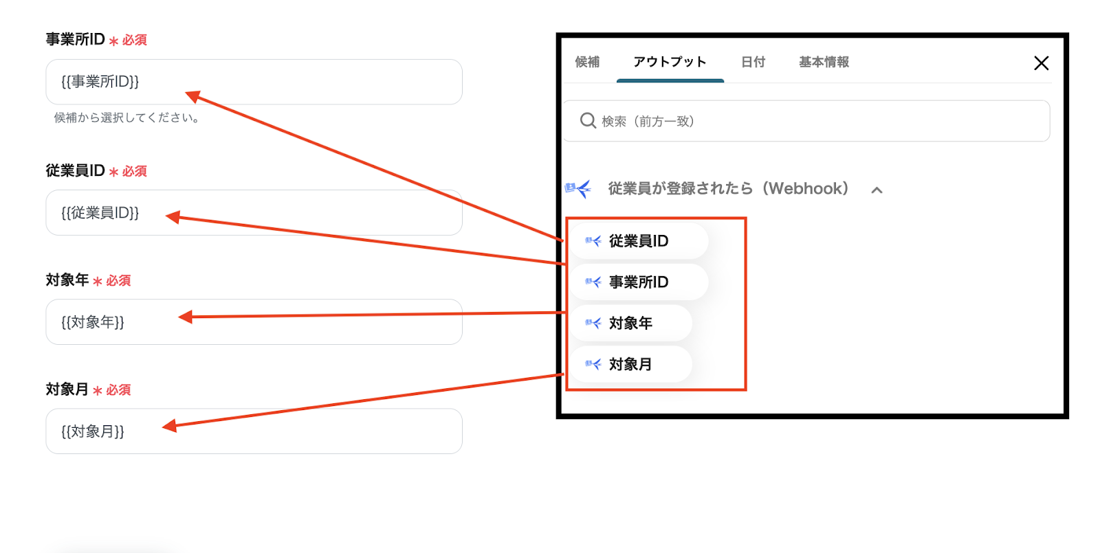 入力バーをクリックすると、前ステップで取得したアウトプットを引用できます。