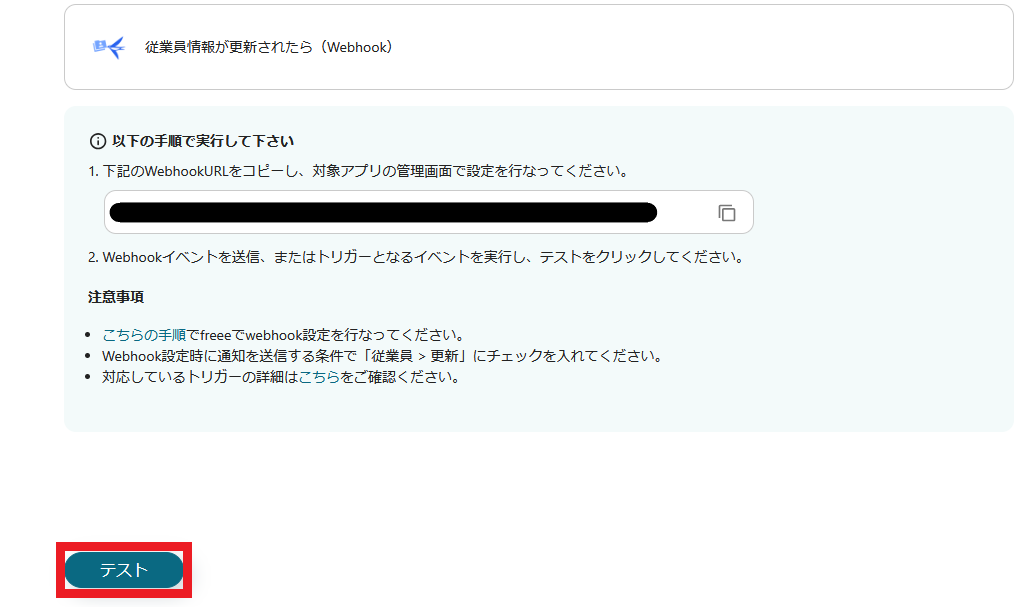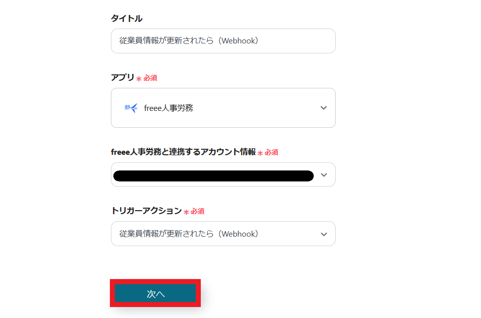 トリガーは、「従業員情報が更新されたら(Webhook)」を選択します。