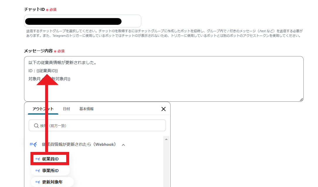 チャットIDの入力欄をクリックすると候補が表示されるので、その中から選択してください。