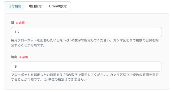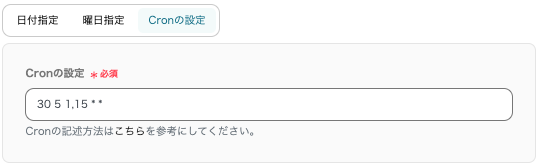 「Cronの設定」は、より細かく通知日時の指定ができます。画像では毎月1日と15日の5:30に通知が送信される設定になっています。