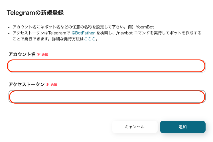 「アクセストークン」はTelegramで新しくBOTを作成し発行・入力してください。