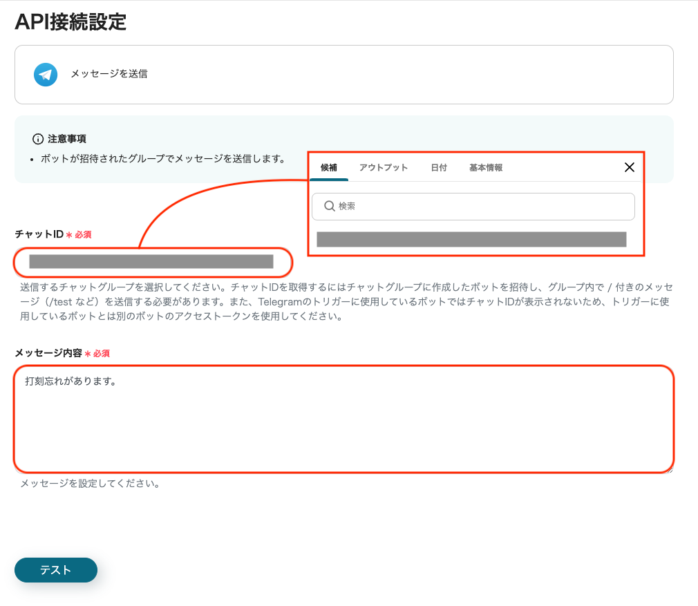 各項目が設定できたら「テスト」をクリックし、メッセージが送信されるか確認しましょう。