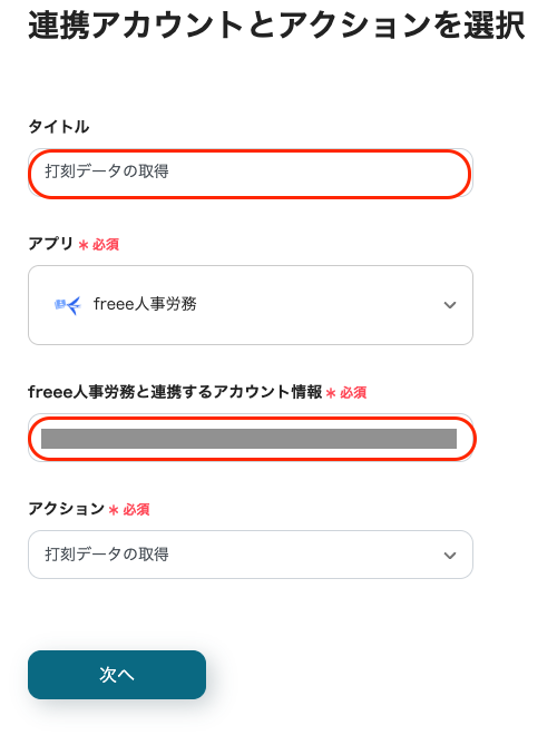 こちらは先ほどと同様にタイトルの任意編集とアカウントの確認を行い、アクションは変更せず「次へ」をクリックして先に進みます。