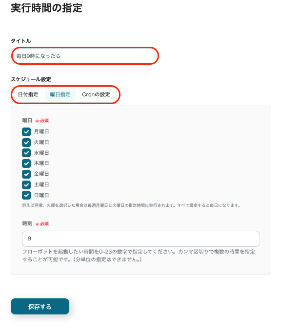 「スケジュール設定」では日時、曜日、Cronの設定から選択できます。今回は「曜日指定」を選択し、毎日午前9時に通知が送信されるよう設定しました。
