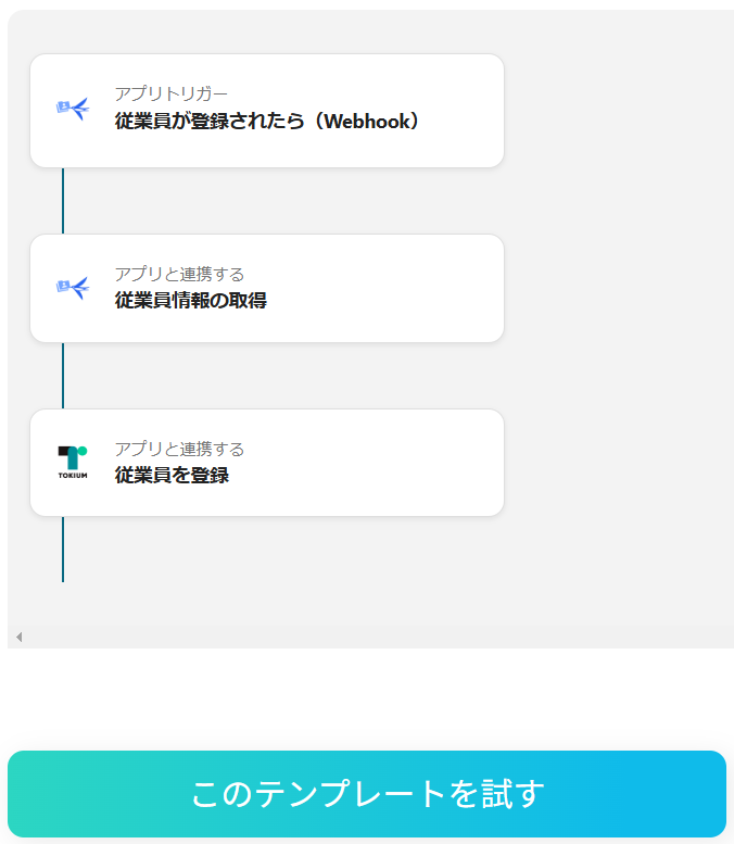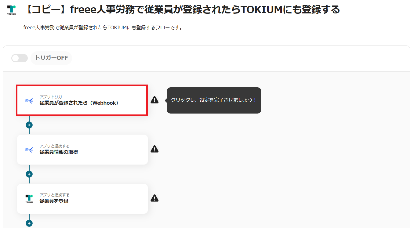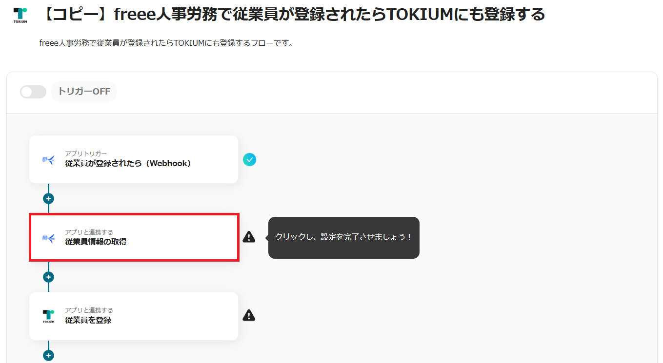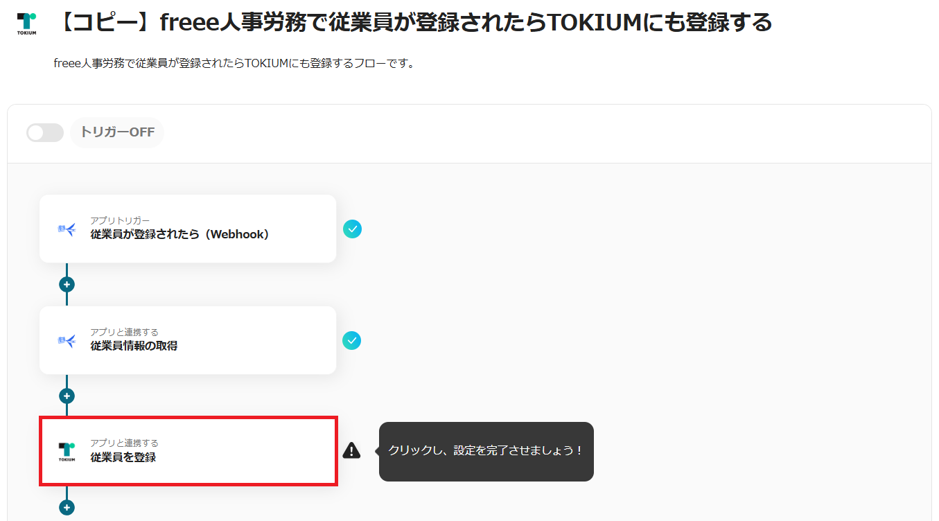 6.トリガーをONにすると、freee人事労務で従業員が登録されるたびにTOKIUMへ自動登録されます。