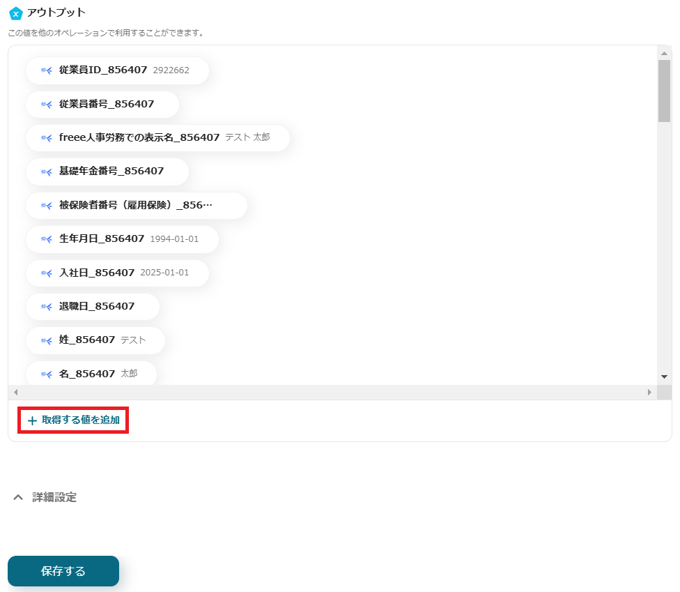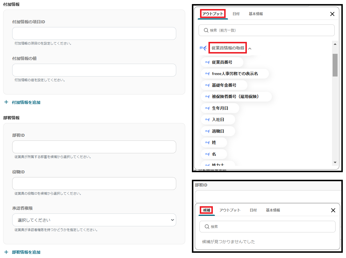※付加情報の項目は、枠をクリックして表示されるアウトプットの「従業員情報の取得」から対応する項目を選択できます。(値は二重括弧で表示されます)