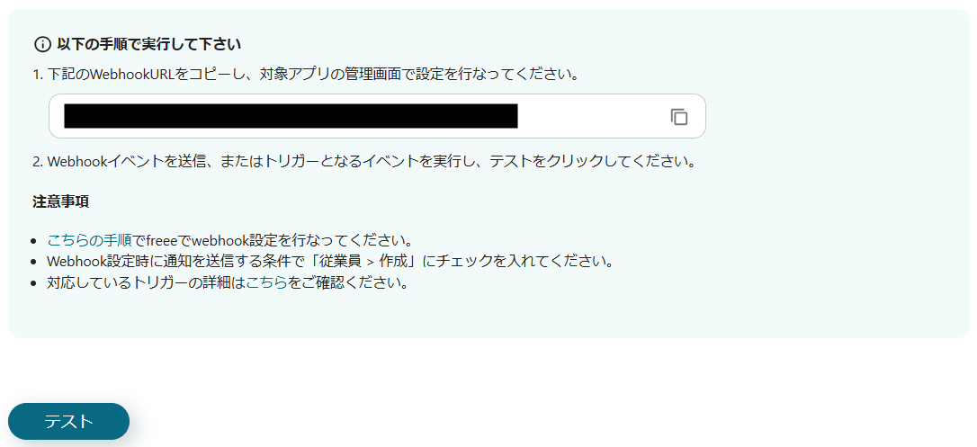 4.WebhookURLをfreee人事労務に設定し、テスト用に従業員を登録したら、「テスト」をクリックします。