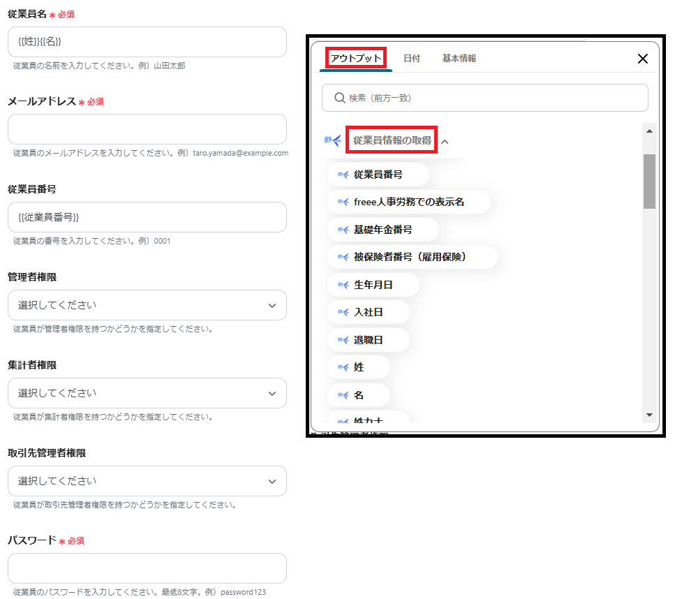 ※空欄の場合は、枠をクリックして表示されるアウトプットの「従業員情報の取得」から対応する項目を選択してください。(値は二重括弧で表示されます)