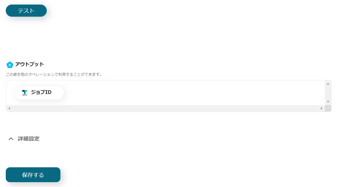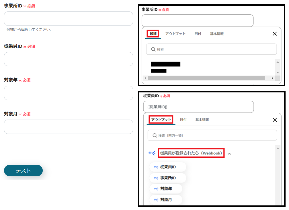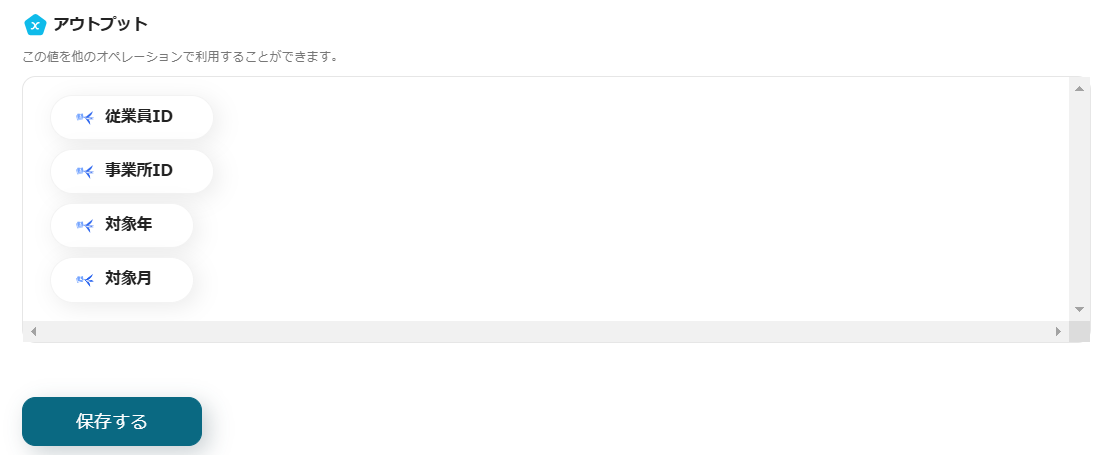 5.テストが成功すると、アウトプットに従業員ID、事業所ID、対象年、対象月が表示されます。