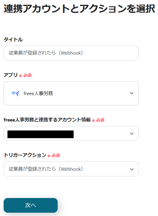 3.freee人事労務と連携するアカウントを確認し、「次へ」をクリックします。