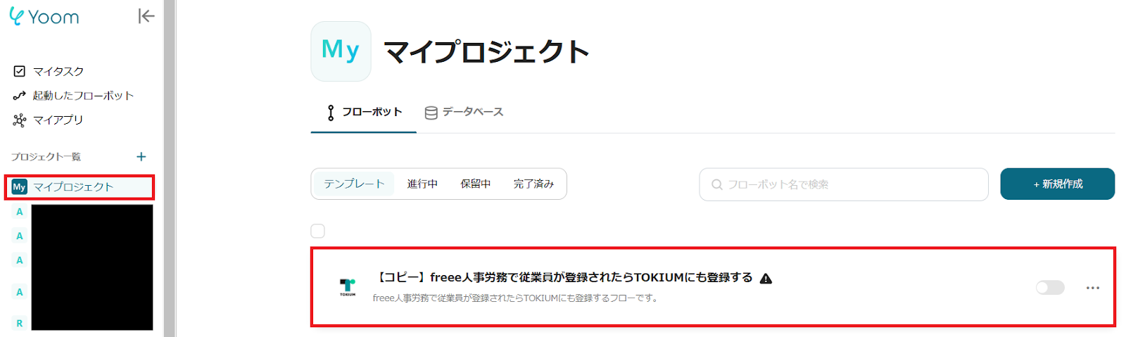 1.Yoom管理画面の「マイプロジェクト」を選択し、「【コピー】freee人事労務で従業員が登録されたらTOKIUMにも登録する」をクリックします。