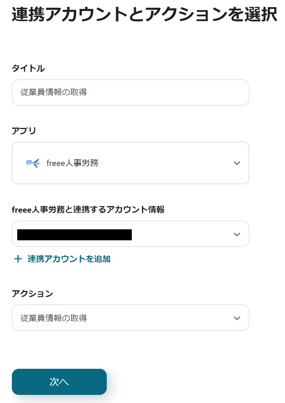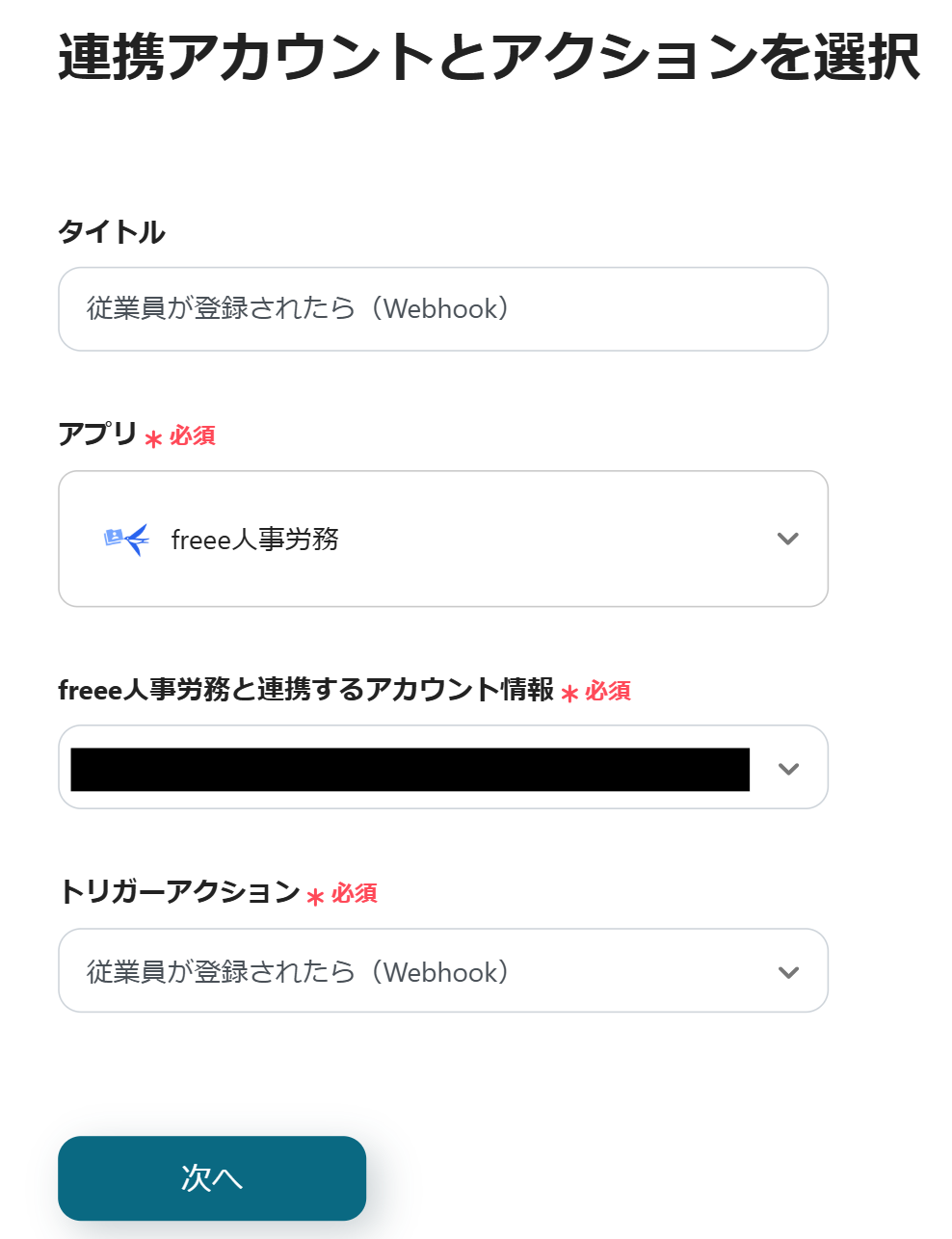 最初に、freee人事労務の設定を行うため、「従業員が登録されたら(Webhook)」をクリックします。
