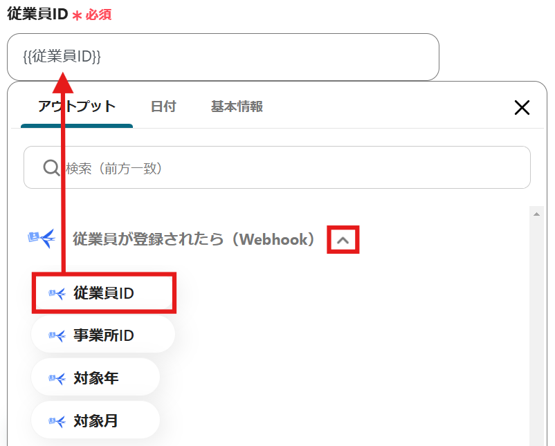 「従業員が登録されたら(Webhook)」のアウトプットから従業員IDを選択してください。