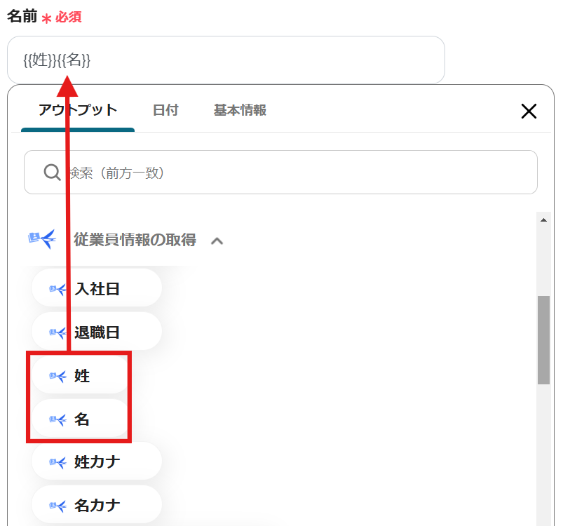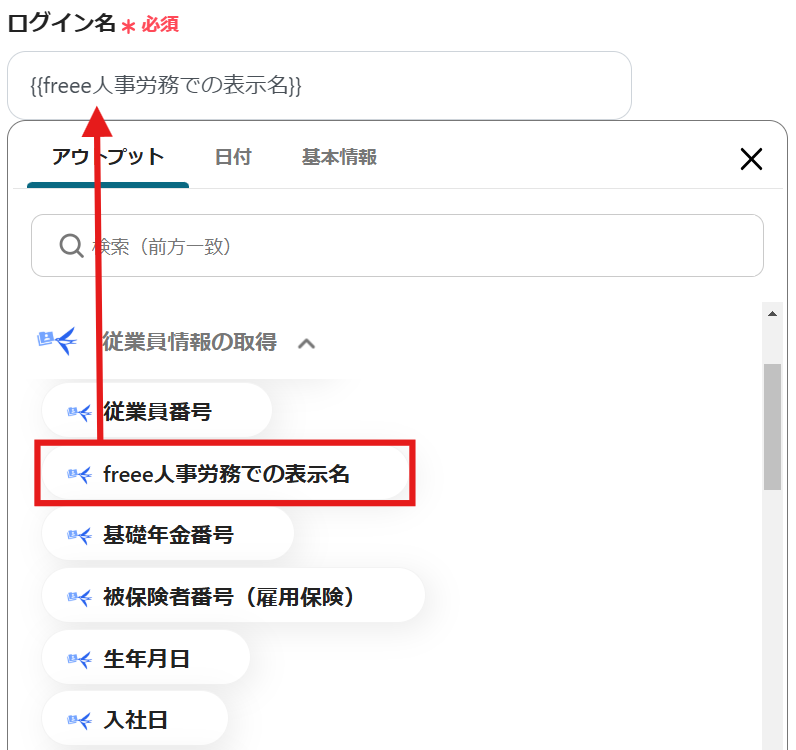 「従業員情報の取得」から以下のようにアウトプットを設定しましょう。