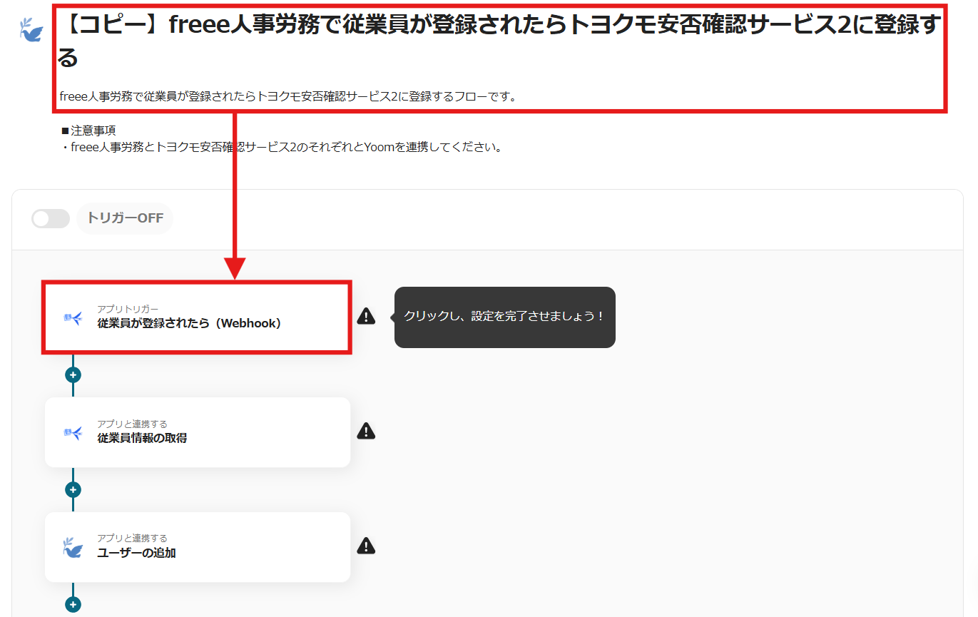 それではここからノーコードツールYoomを使って、「freee人事労務で従業員が登録されたらトヨクモ安否確認サービス2に登録する」方法をご説明します。