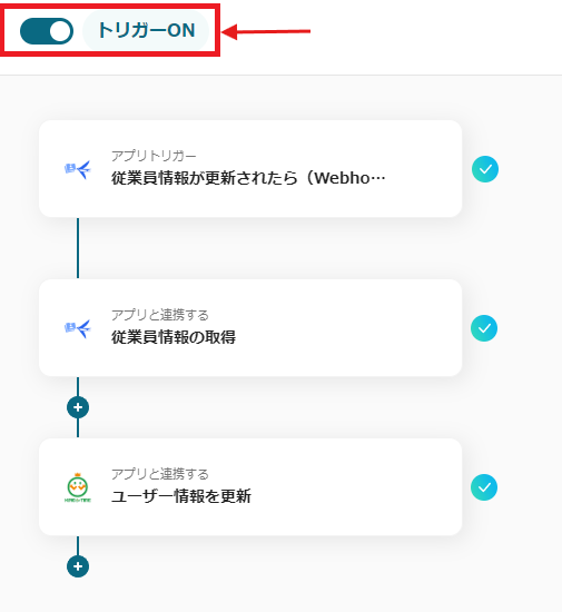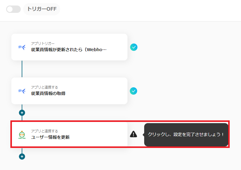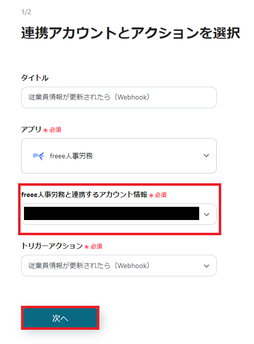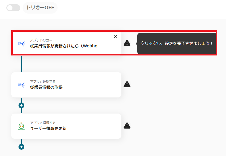 最初に「従業員情報が更新されたら(Webhook)」を選択してください。
