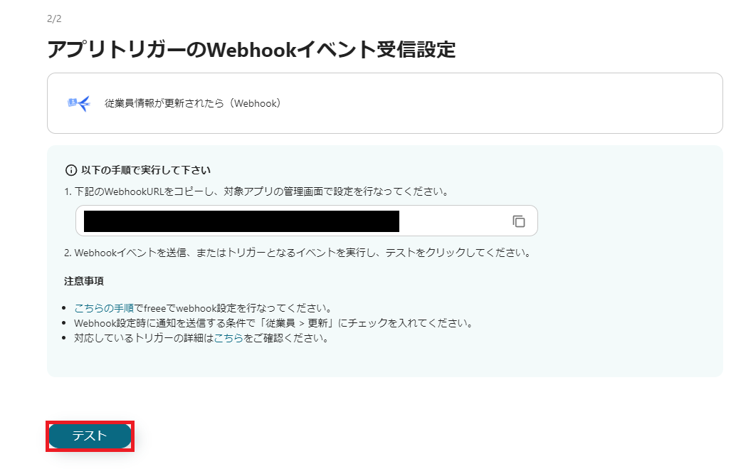 設定が完了したら、freee人事労務で従業員情報の更新操作を行い、「テスト」をクリックしましょう。