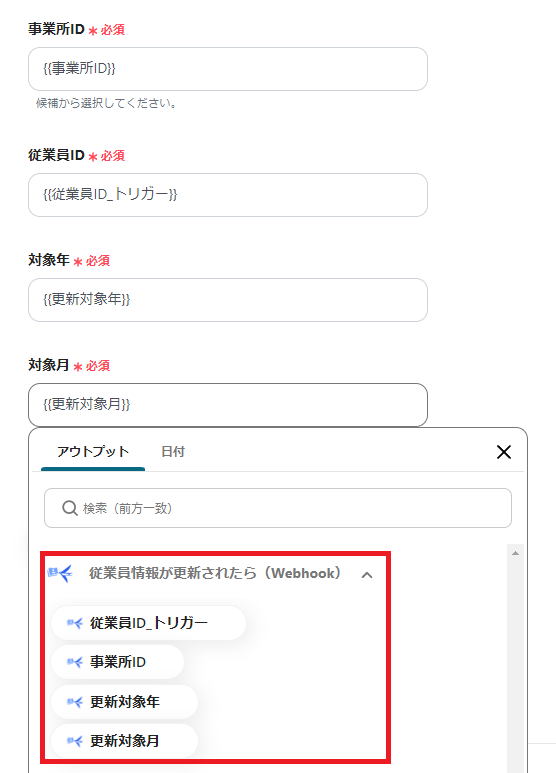 ・必須および任意項目:それぞれの必要項目に①のトリガーから取得したアウトプット項目を埋め込みます。