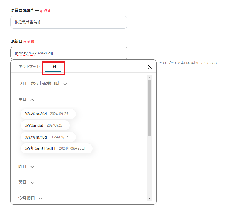 更新日は、「取得した値」タブ横の「日付」を使用することで設定ができます。