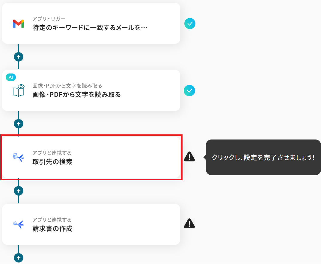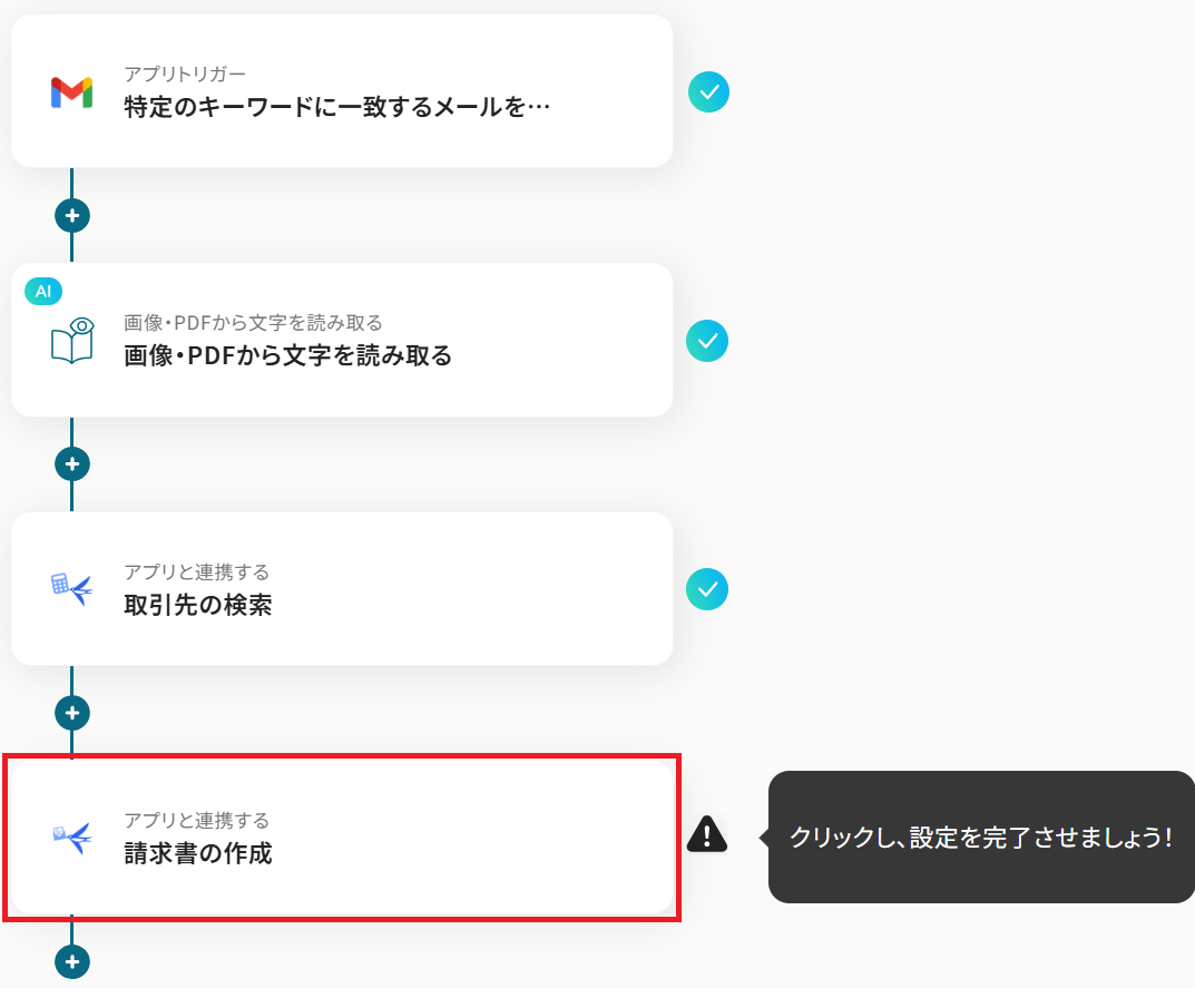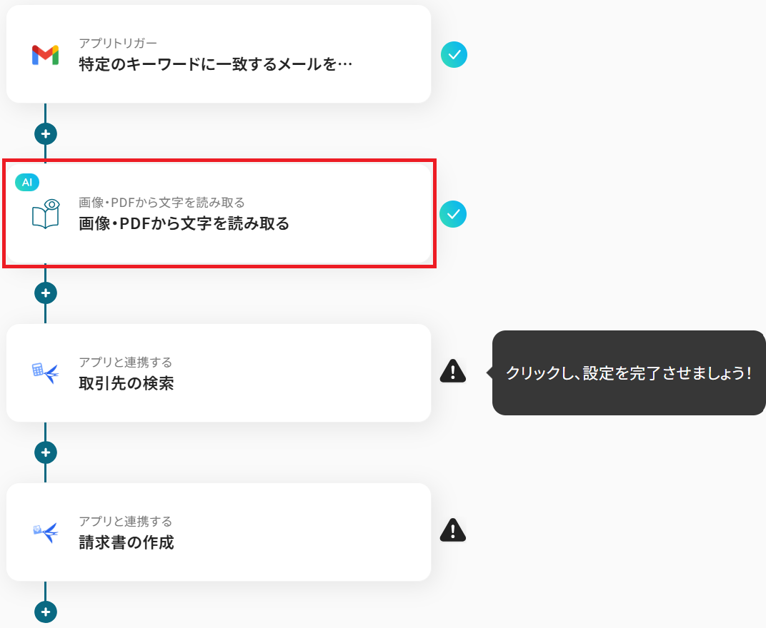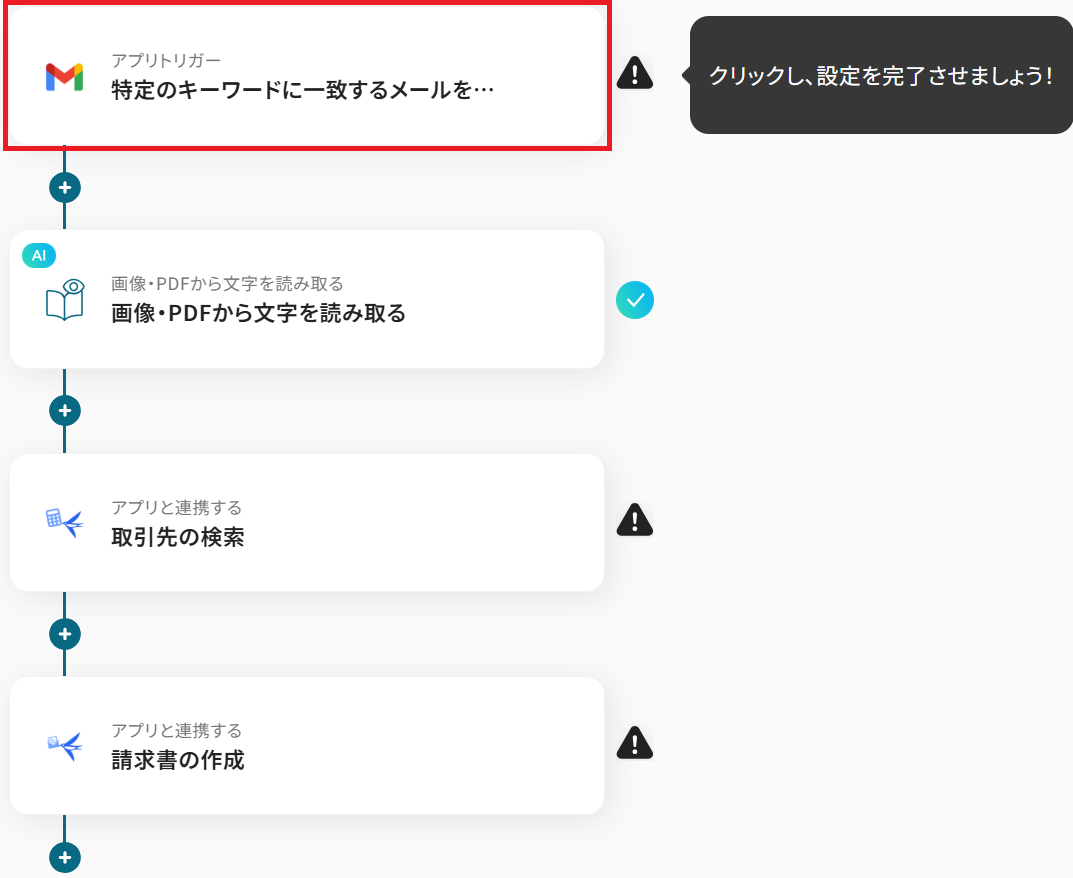 - Gmailのトリガー設定、OCR設定、freee会計およびfreee請求書のアクション設定