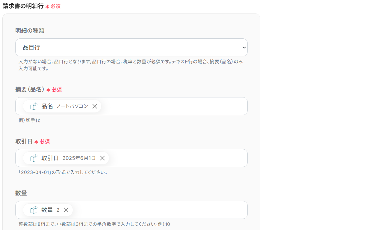 freee請求書 APIの請求書作成アクションは、メールの添付ファイルやフォームの入力内容など、様々な情報をもとに請求書を自動で作成する際に活用できます。例えば取引先から受注メールを受け取ったら、その内容を読み取って自動で請求書を作成するといったフローを構築して、手作業による作成の手間と入力ミスを削減しましょう。