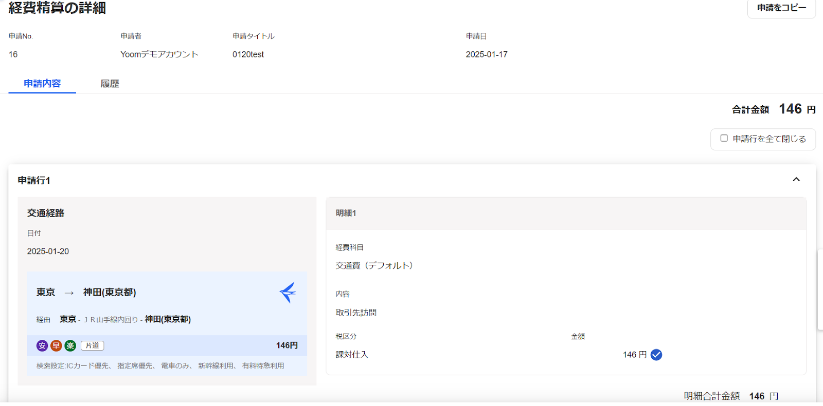 Webhookの設定が終わったら、以下のようなテスト経費申請をしましょう。