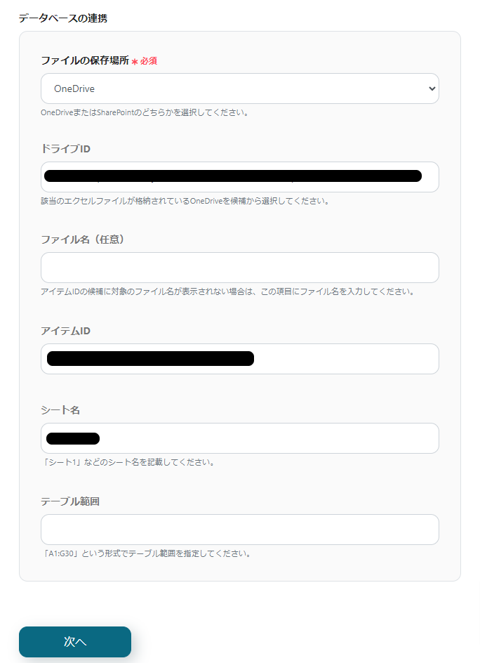 1ページ目では、freeeサインと同様に、アカウント情報などが載っている下にある欄でレコード更新をするMicrosoft Excelのシートの指定を行います。
