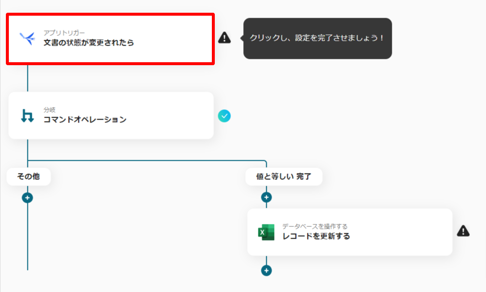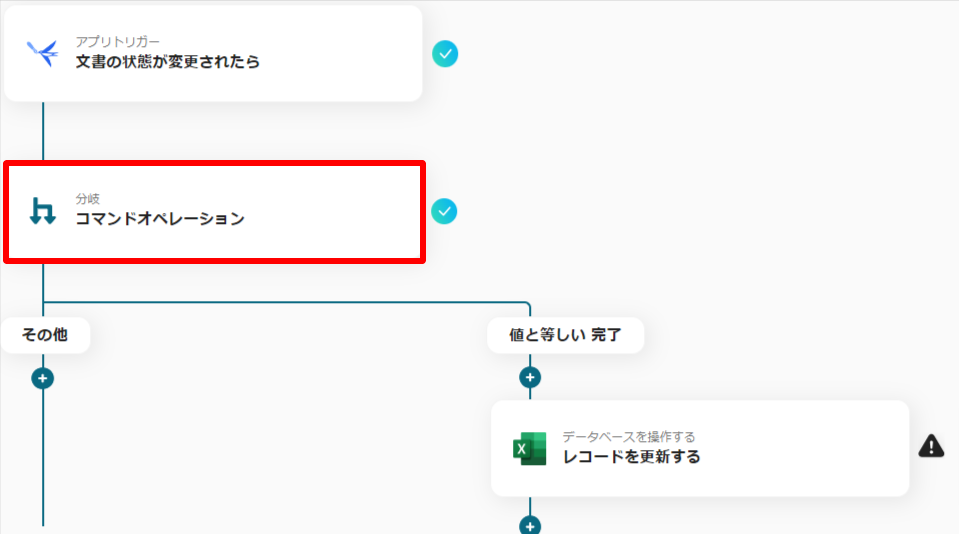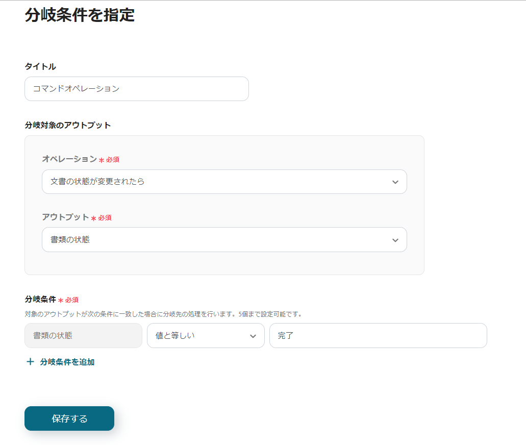 上記画像の場合、「文章の状態が変更されたら」のフローで取得した「書類の状態(アウトプット値)」が「完了」になることを条件として指定しています。