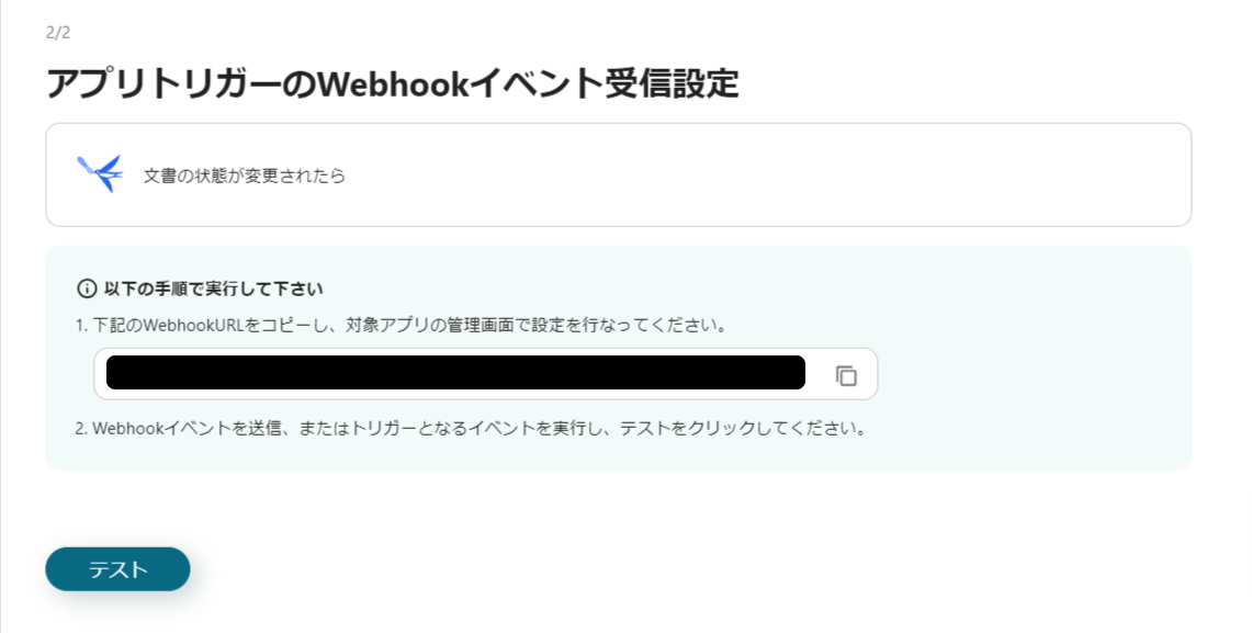 設定ができたら、テストのためにfreeeサイン上で文章の状態を変更(契約完了状態に変更)してから「テスト」をクリックしてください。
