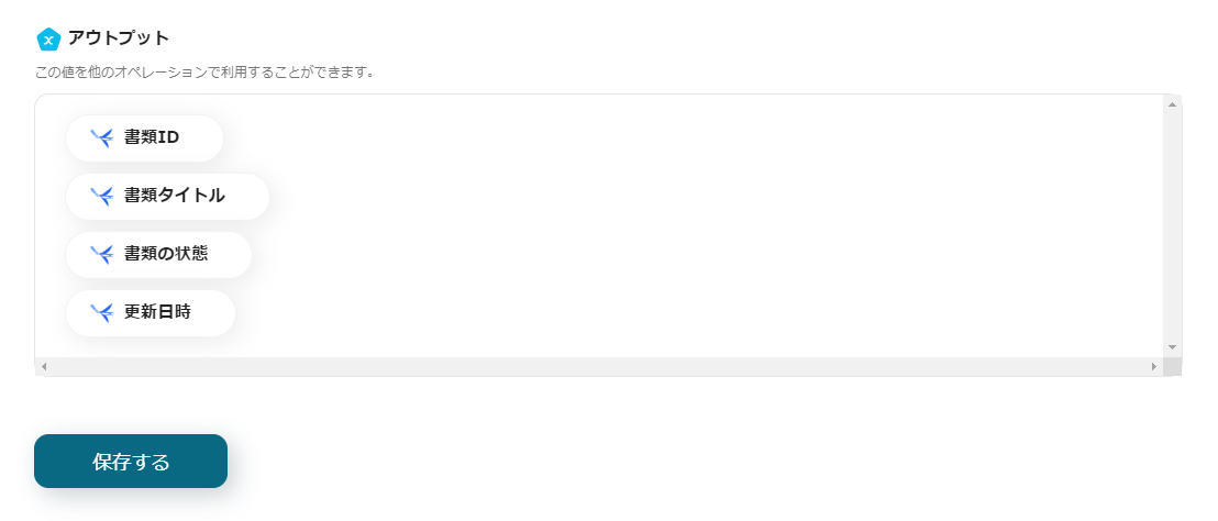 アウトプットが正しく取得できていれば「保存する」でアプリトリガー設定は完了です。