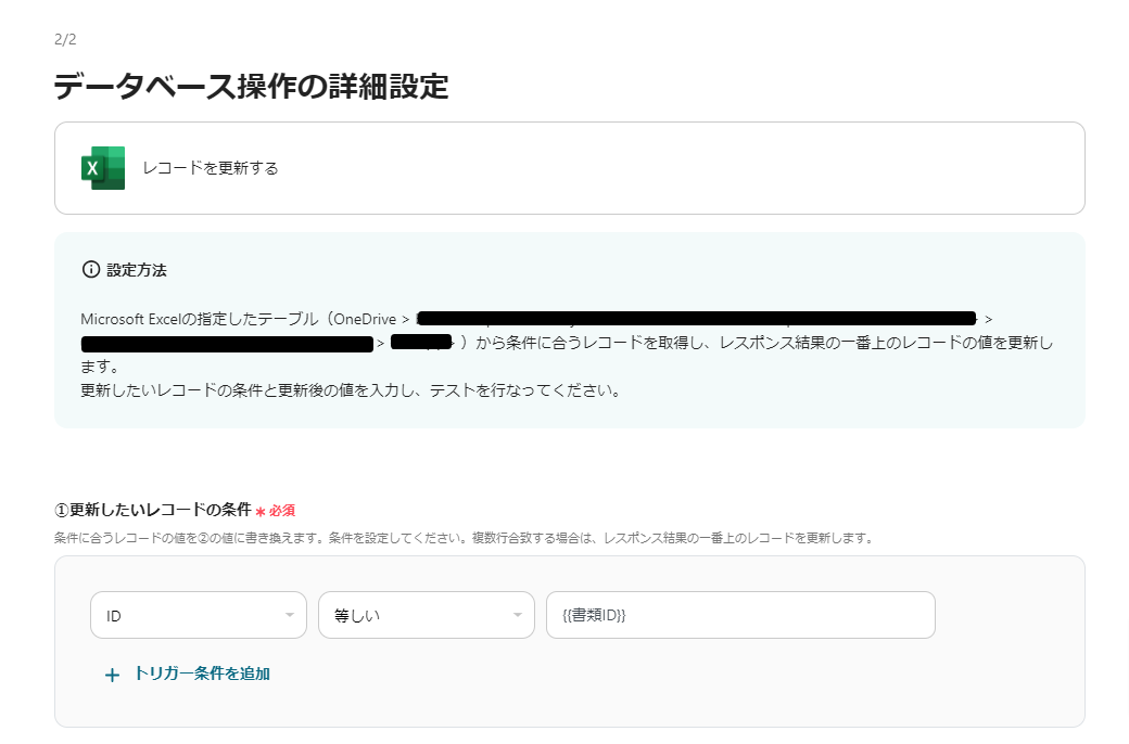 上記画像の場合は、IDの項目がアウトプットで取得した書類IDと一致するものを条件にしています。
