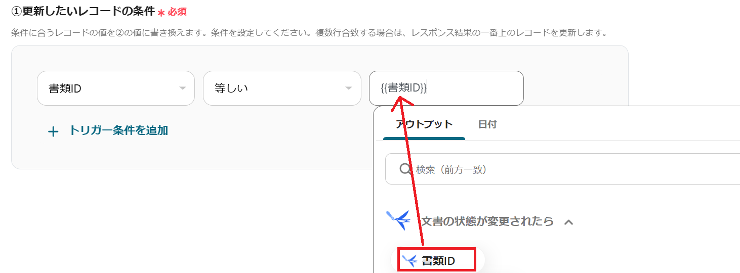 - Google スプレッドシートの「レコードを更新する」アクションを設定し、トリガーをONにする