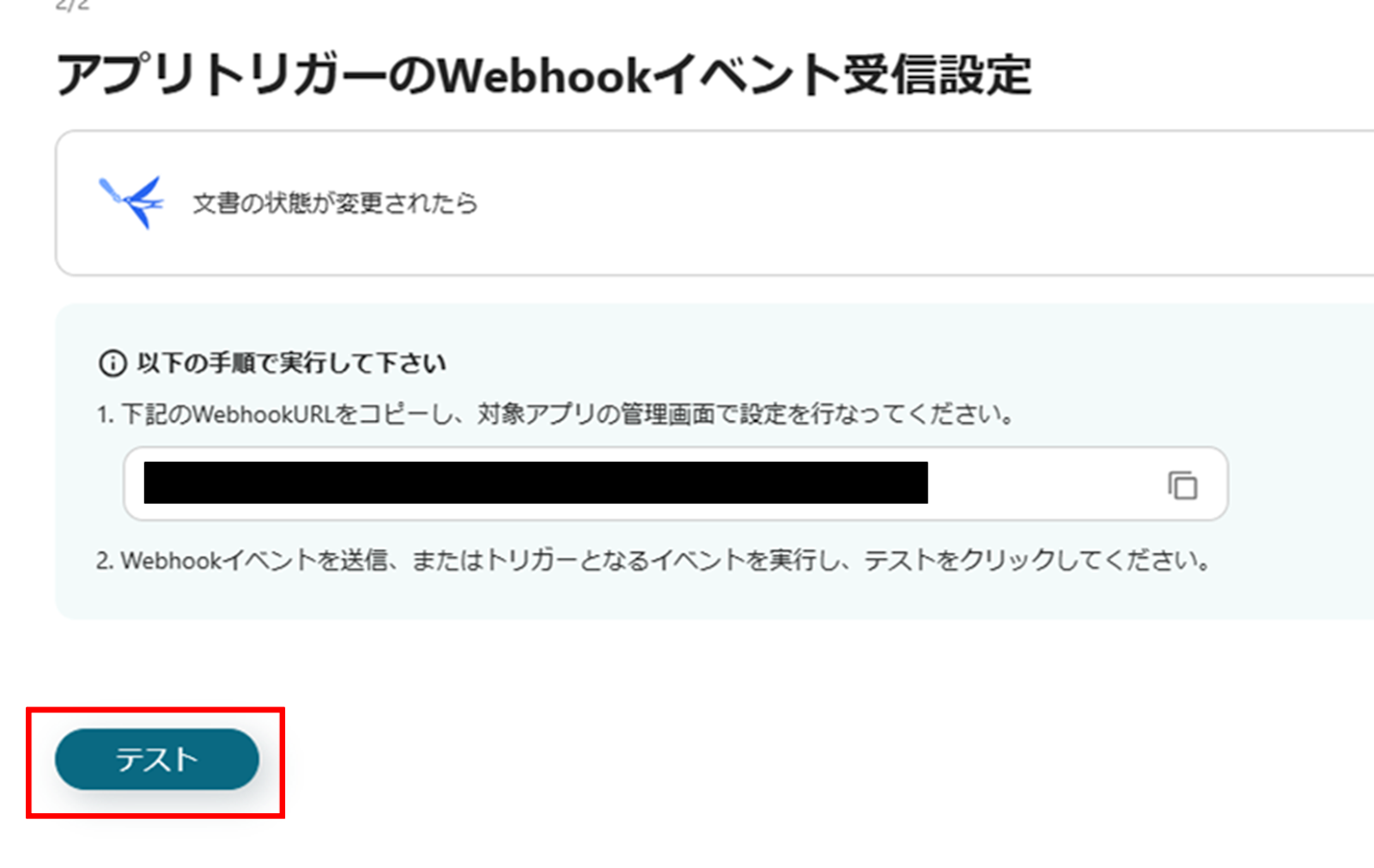 (3)アプリトリガーのWebhookイベント受信設定画面にて、 表示されたWebhookURLをコピーし、対象アプリの管理画面で設定を行なってください。設定が完了したら、「テスト」をクリックし、エラーとならなければ「保存する」をクリックします。