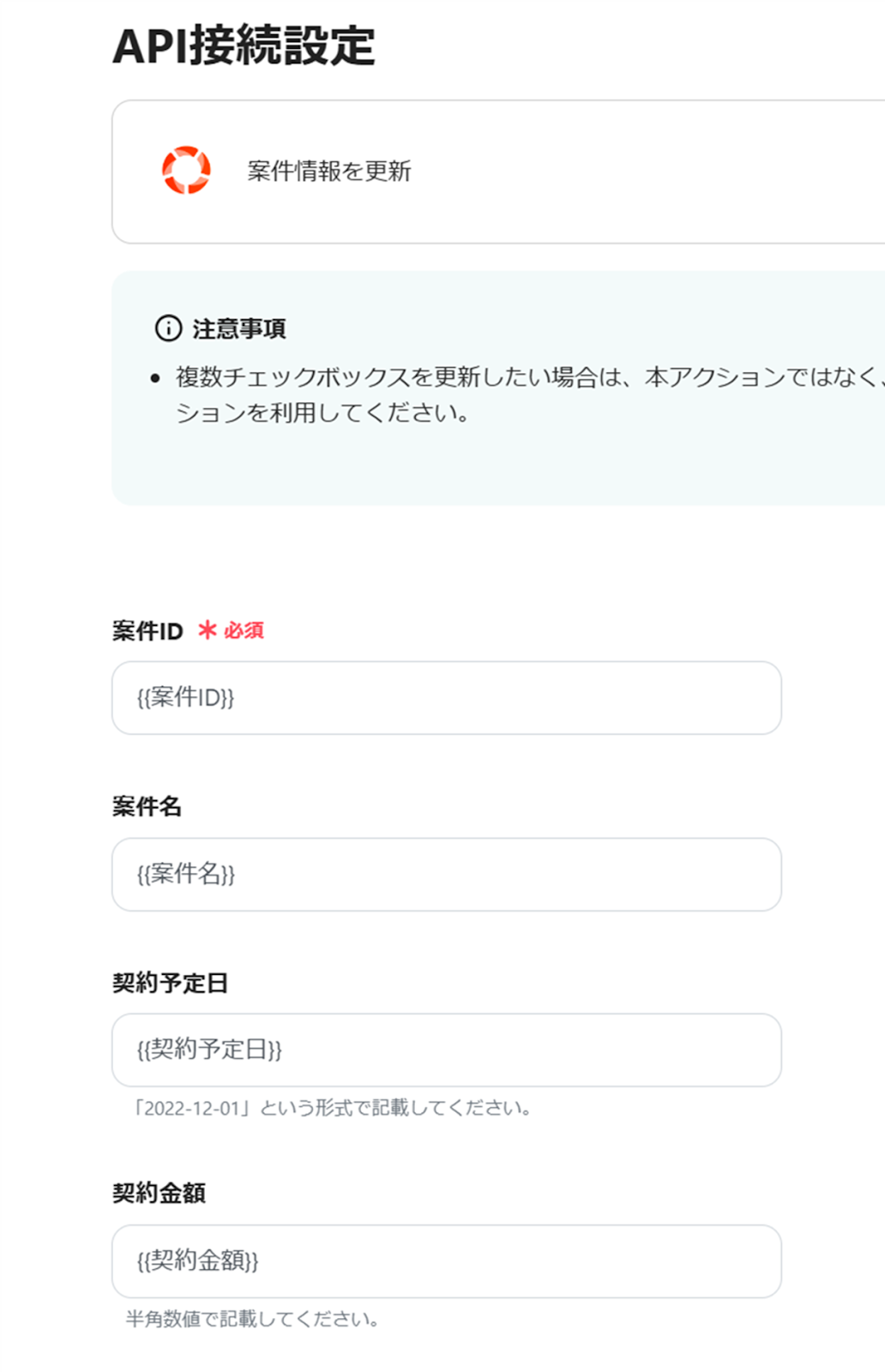 (6)API接続設定画面が出るので、更新したい項目にアウトプットもしくは候補から選択し入力をします。入力が完了したら、下部にある「テスト」をクリックし、エラーとならなければ、「保存する」をクリックします。