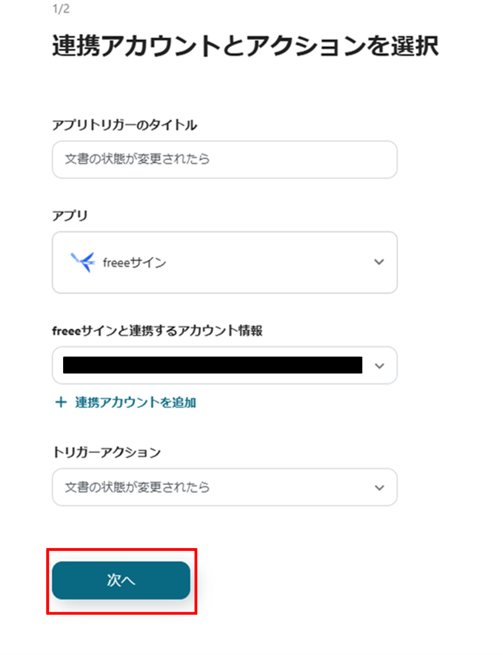 (2)連携アカウントとアクションを選択画面が出てくるので、freeeサインと連携するアカウント情報に誤りがないかを確認し、トリガーアクションは「文書の状態が変更されたら」のままで「次へ」をクリックします。