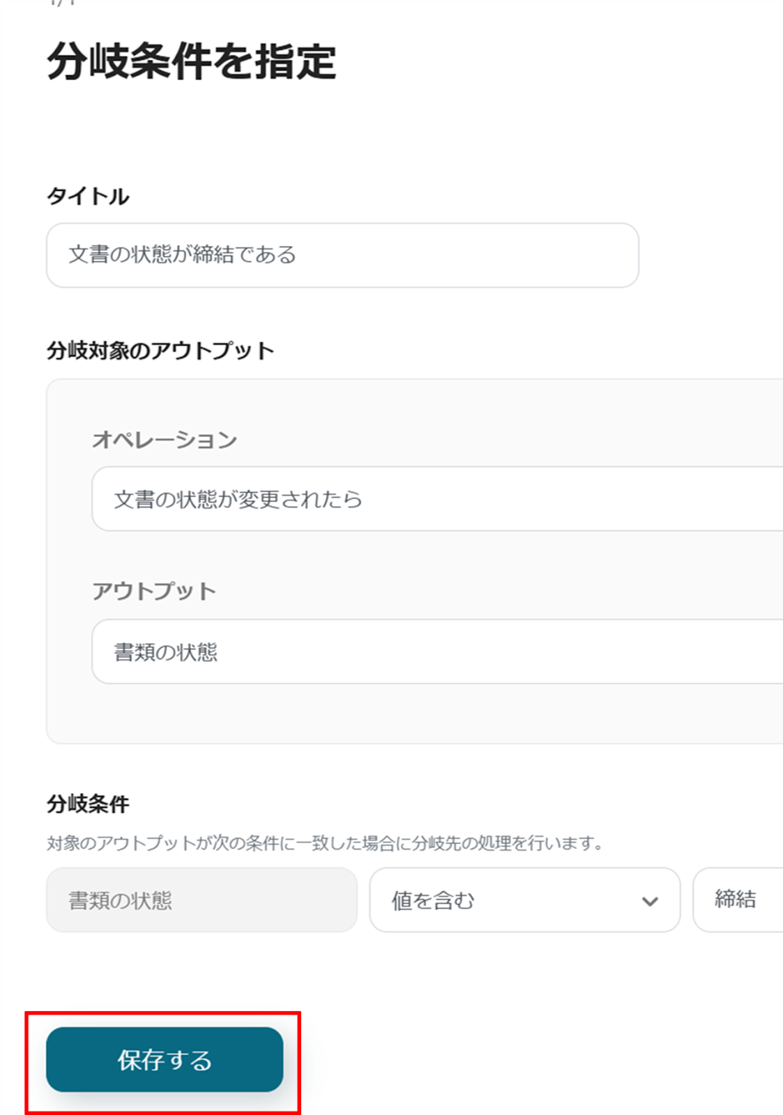 (2)分岐条件の設定画面が出てくるので、分岐条件をプルダウンより選択します。選択が完了したら、「保存する」をクリックします。