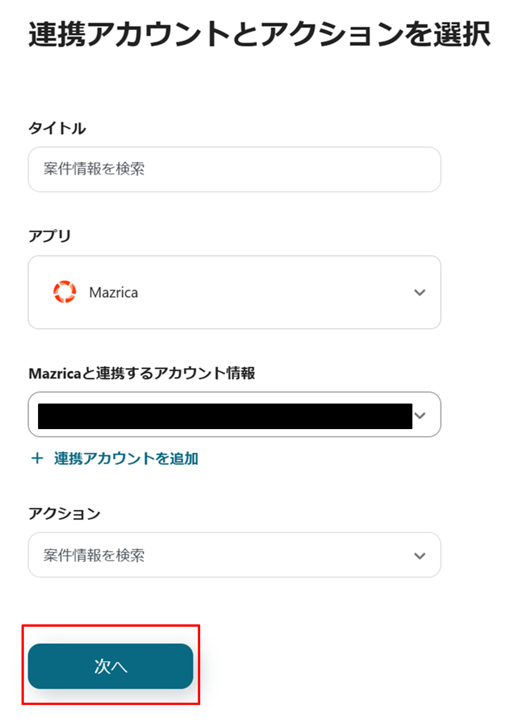 (2)連携アカウントとアクションを選択画面が出てくるので、Mazricaと連携するアカウント情報に誤りがないかを確認し、アクションは「案件情報を検索」のままで「次へ」をクリックします。