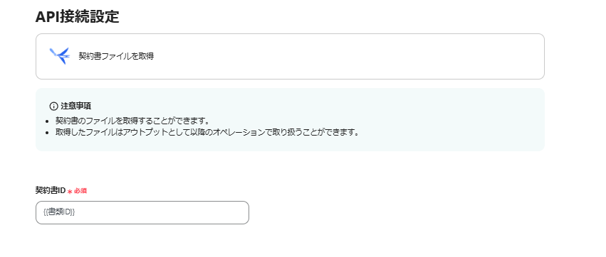 API接続設定の画面となり、「契約書ID」の箇所に「{{書類ID}}」と入力されています。