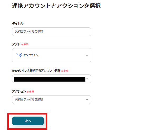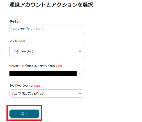 今回連携するfreeeサインのアカウント情報と間違いないかを確認し、「次へ」をクリックしましょう。