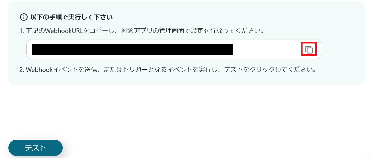 以下の画面が表示されるので、赤枠をクリックしてWebhook URLをコピーします。