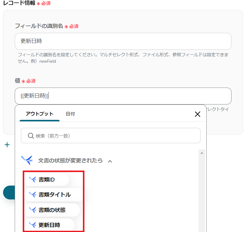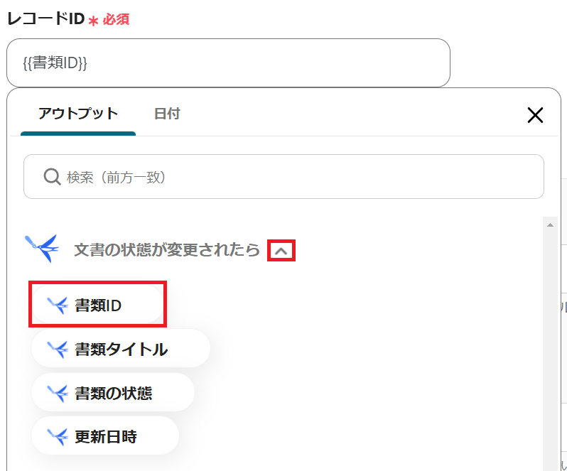 freeeサインのアウトプットを使用して、「書類ID」を選択します。