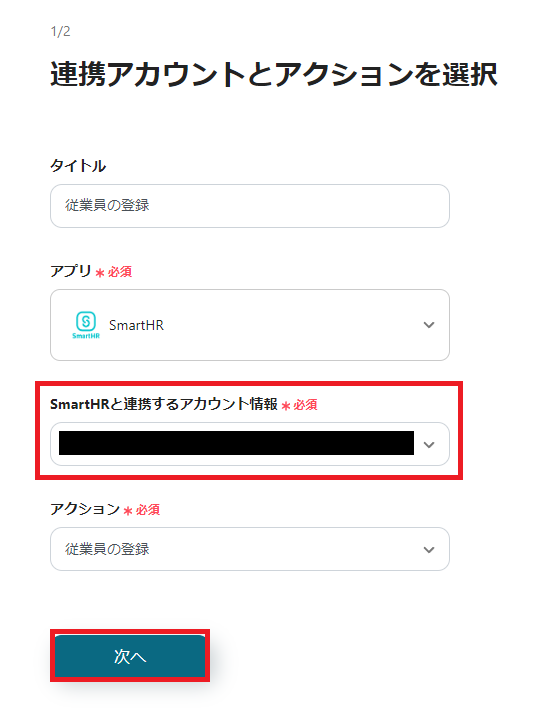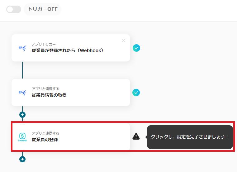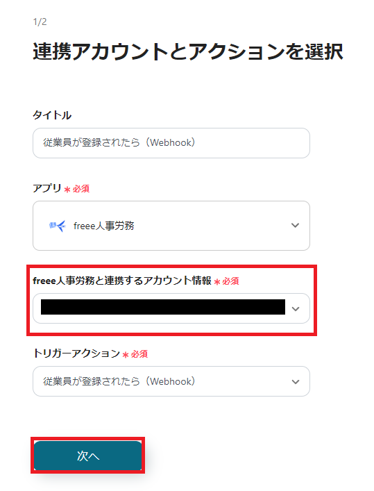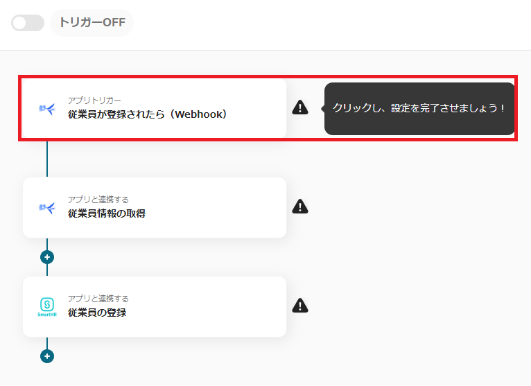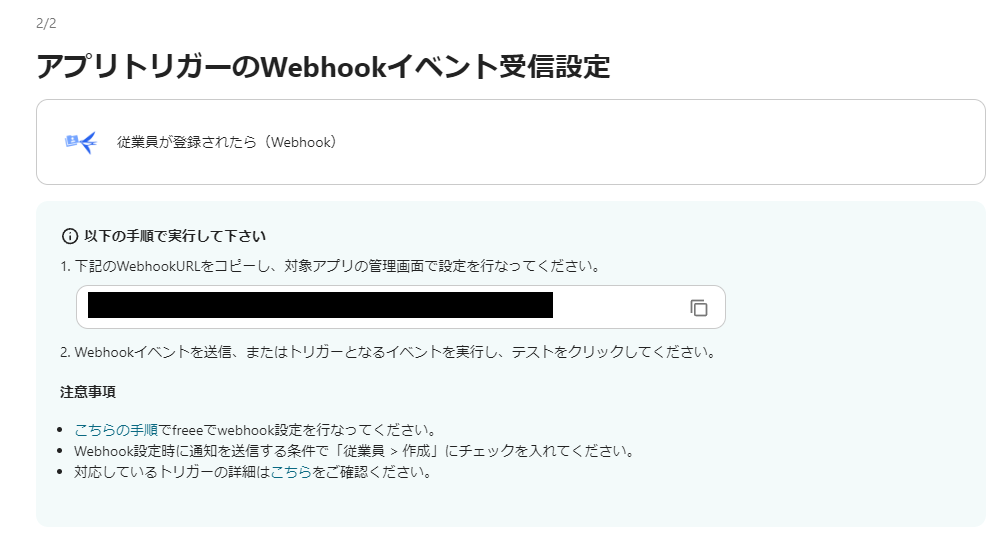 まずは「従業員が登録されたら(Webhook)」を選択して、設定の確認をしていきます。